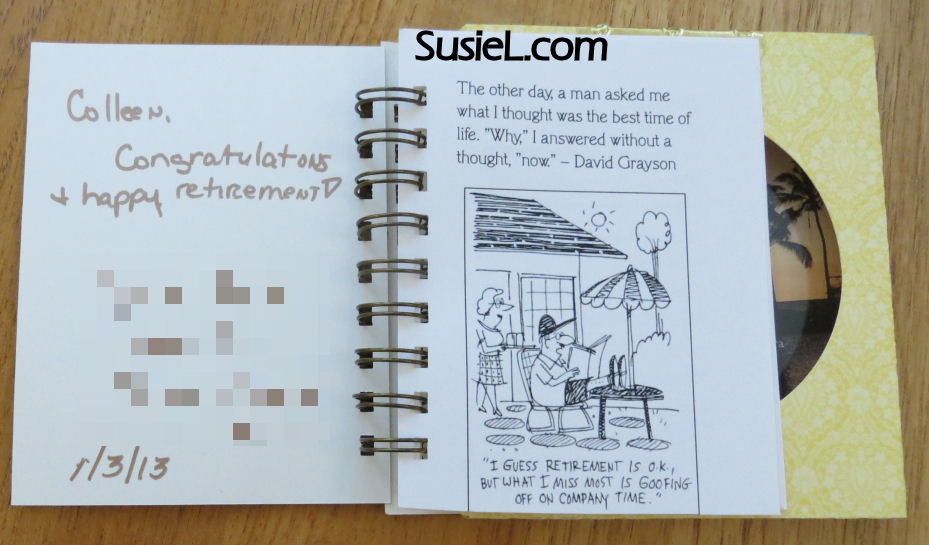 A friend of ours retired last year. I compiled a CD of retirement songs & made a card that was attached to the box by using the Zutter Bind-It-All. I pretty much finished this five minutes before walking out the door to the retirement party, so this is the only photo I got of it. I need to make another one for someone else, so will try to get more photos of that one before giving it to the recipient.