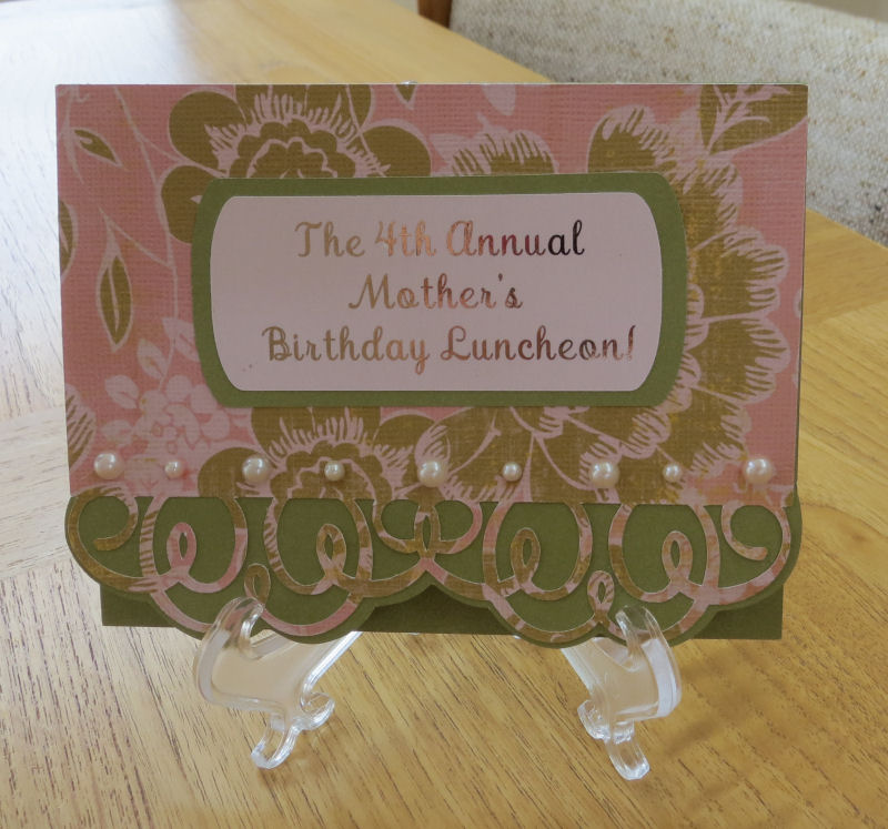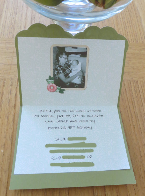 I’m only about seven months late in posting this, but I guess better late than never, eh? As some of you may already know, my mother passed away two months shy of her 95th birthday in 2012. In an effort to not focus on being sad that day, I decided to have a girls luncheon to celebrate the day and decided to make it an annual event. I do it up all girly, send real live invitations, use my wedding china & good silver & crystal. Previous years are here: 2013, 2014) Here’s the one from June 2015.