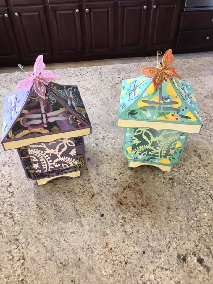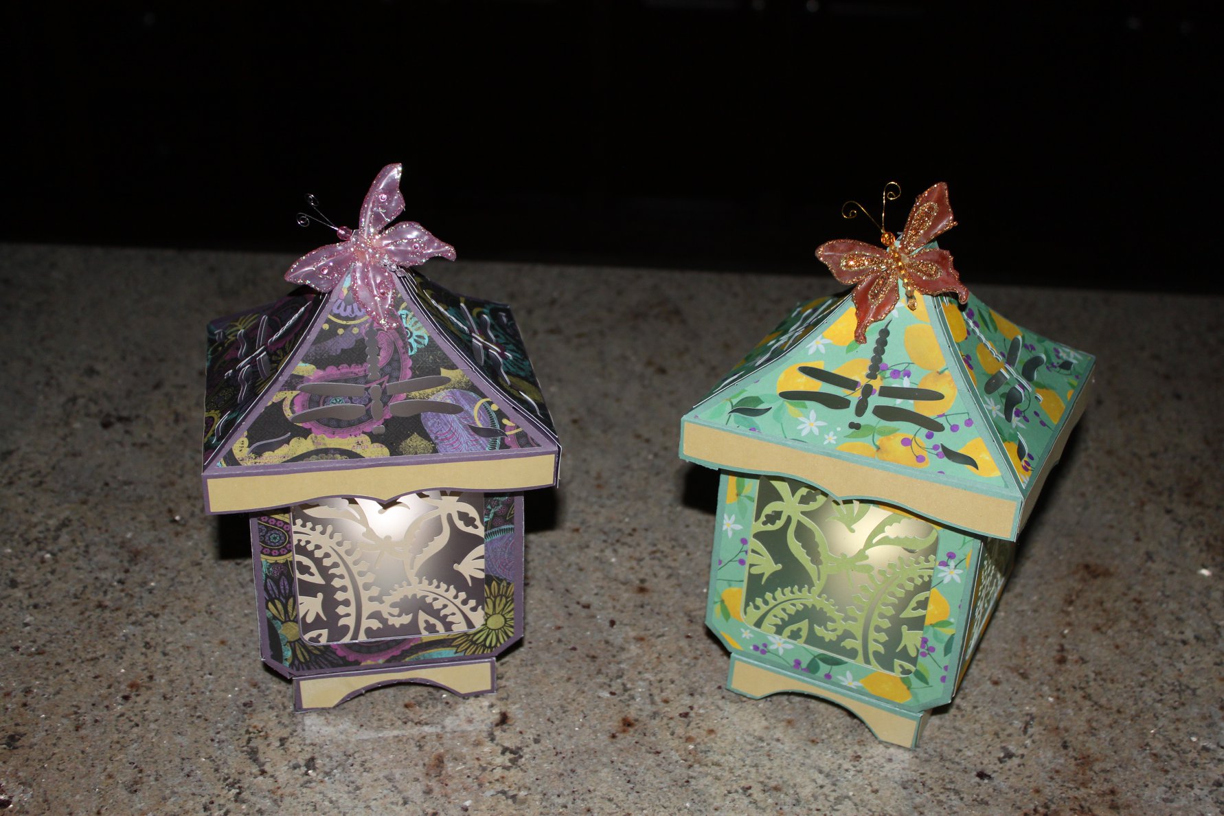 I love these. So I made one for me & one for a friend. Since this was a Covid-19 quarantine project & I didn’t have any vellum (at least that I could find… we moved a few months ago & I still don’t know where everything is), I used 8 1/2 x 11 inch heat laminating sheets. Tore them apart (so they were single layer) Put the shiny side down on the mat & adhered the matte side facing out, so it resembles vellum. I then used small, flameless votives for the lighting.