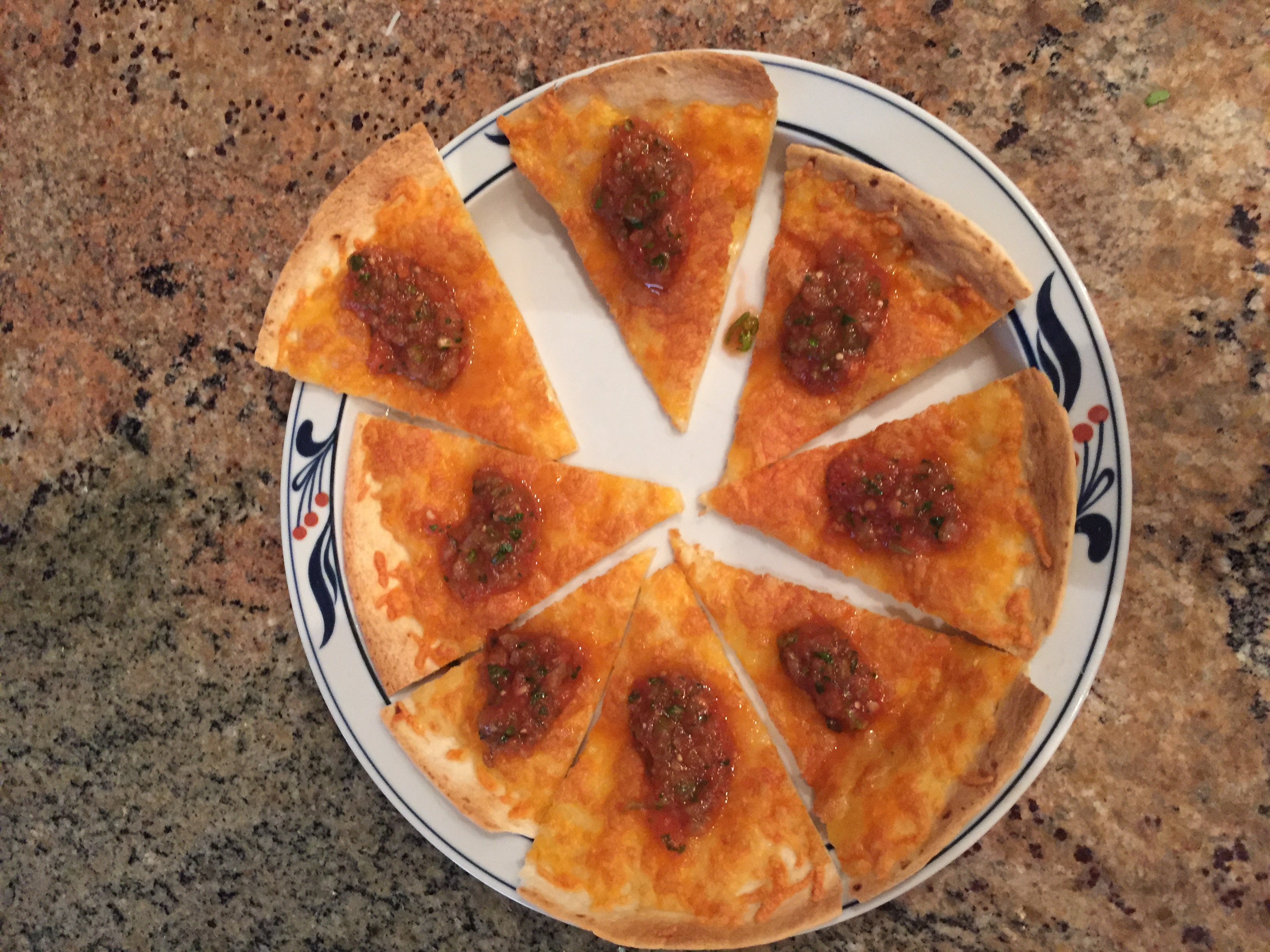 And here is the final product on my lunch. Here in Arizona, we call these “cheese crisps”. Cheese broiled over a tortilla & sliced like a pizza.