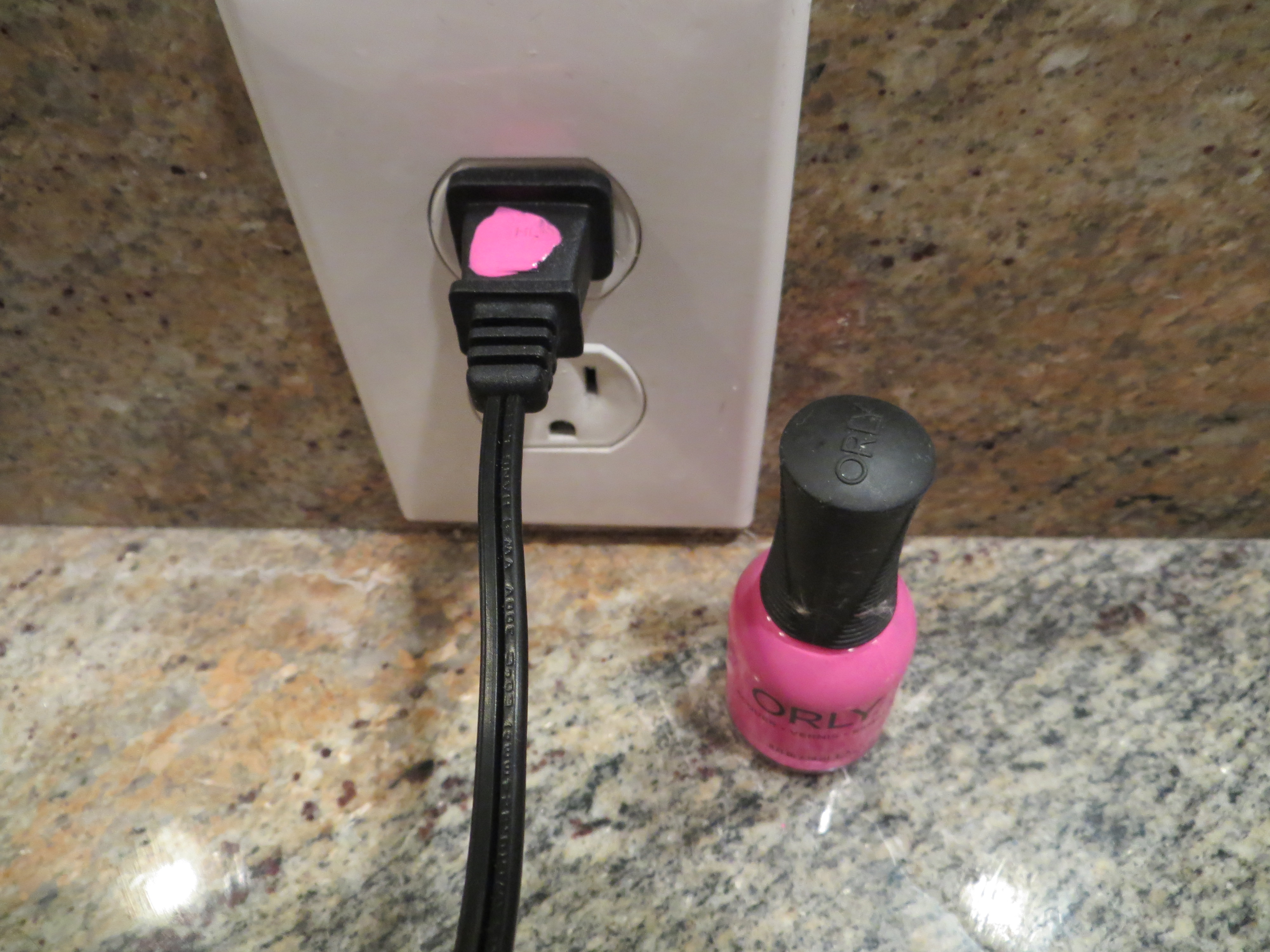Here’s a tip I’ve used for years.  You know how you go to plug in an electric appliance and it will only go in one way because the plug is polarized?  Meaning one blade is wider than the other?  Instead of fiddling with it each time, take some bright pink or red nail polish & paint the side that goes on top.  If the plug is not polarized, I paint both sides.  It’s not a huge time saver.  But I do find it helpful.  And all my appliances have red or pink nail polish on them.