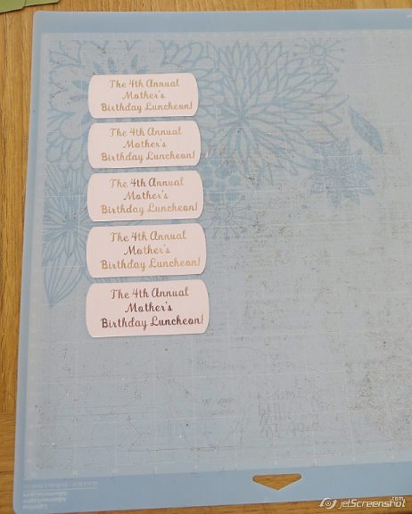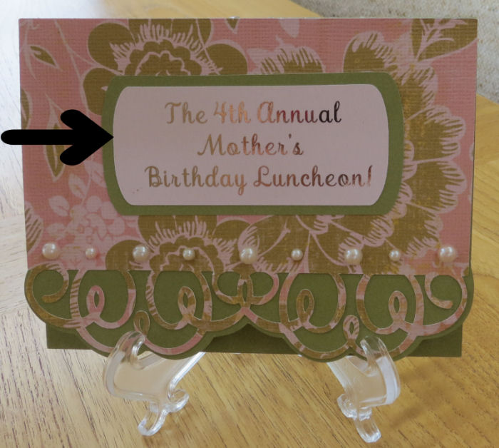 Here is the final product, which is strictly the label/tag/sentiment announcing what the event is. It may look like it’s printed on white paper, but it’s not. It’s printed on a very light pink digital paper. I will show you how I did this.